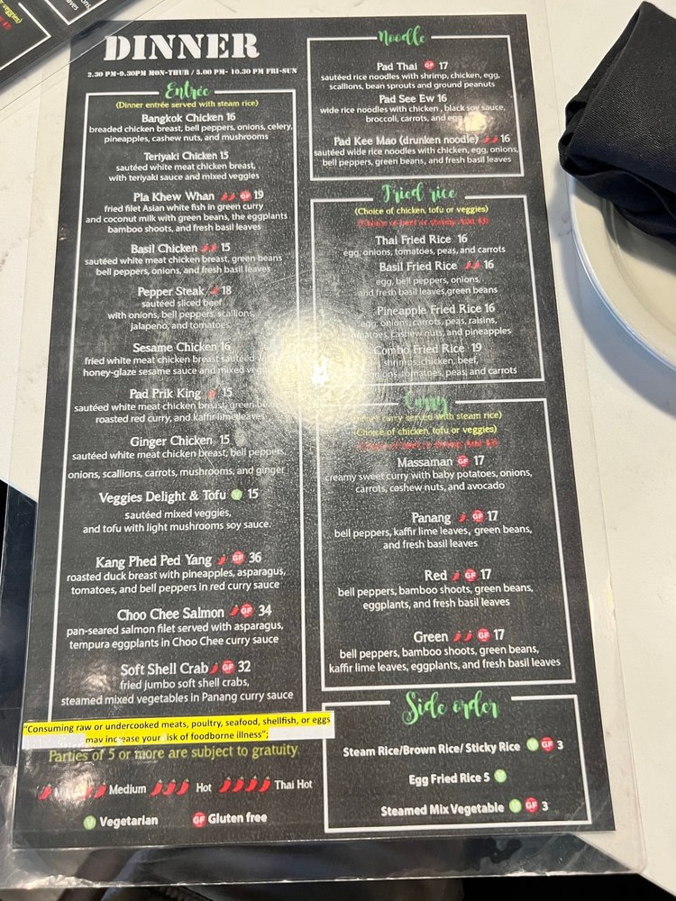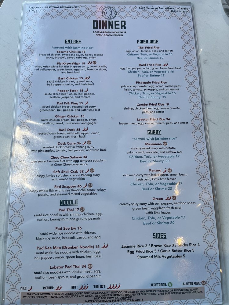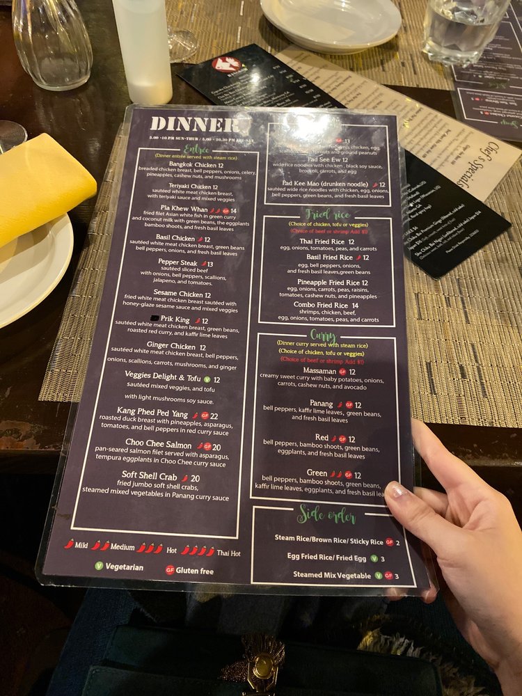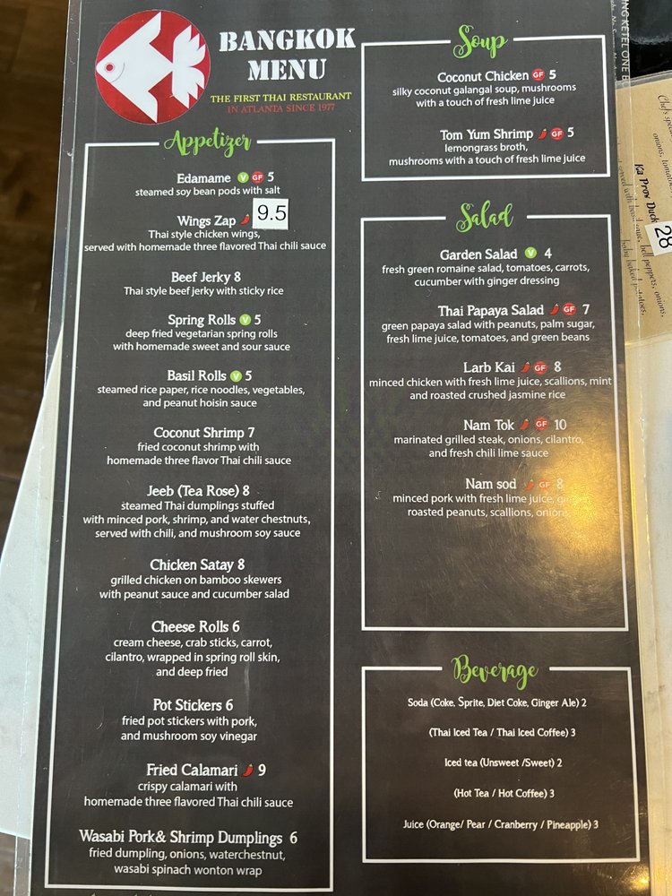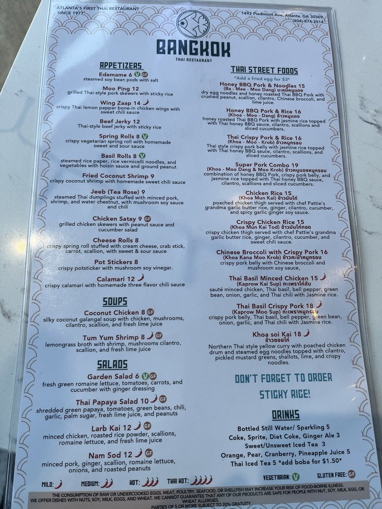 Introducing the menu at Bangkok Thai Restaurant, located in Atlanta, GA, offers a variety of authentic Thai dishes. Starting with appetizers such as the Bangkok Cheese Roll and Chicken Satay, the menu also includes flavorful soups like Coconut Chicken Soup and Tom Yum Shrimp. The salads, like the Larb Kai and Thai Papaya Salad, are refreshing and packed with unique flavors. The restaurant provides a range of options for vegans and vegetarians, along with various payment methods including credit cards and cryptocurrency. With amenities like wheelchair accessibility and outdoor seating, Bangkok Thai Restaurant caters to a diverse range of customers. Don't miss out on the chance to enjoy delicious Thai cuisine in a welcoming and vibrant atmosphere.